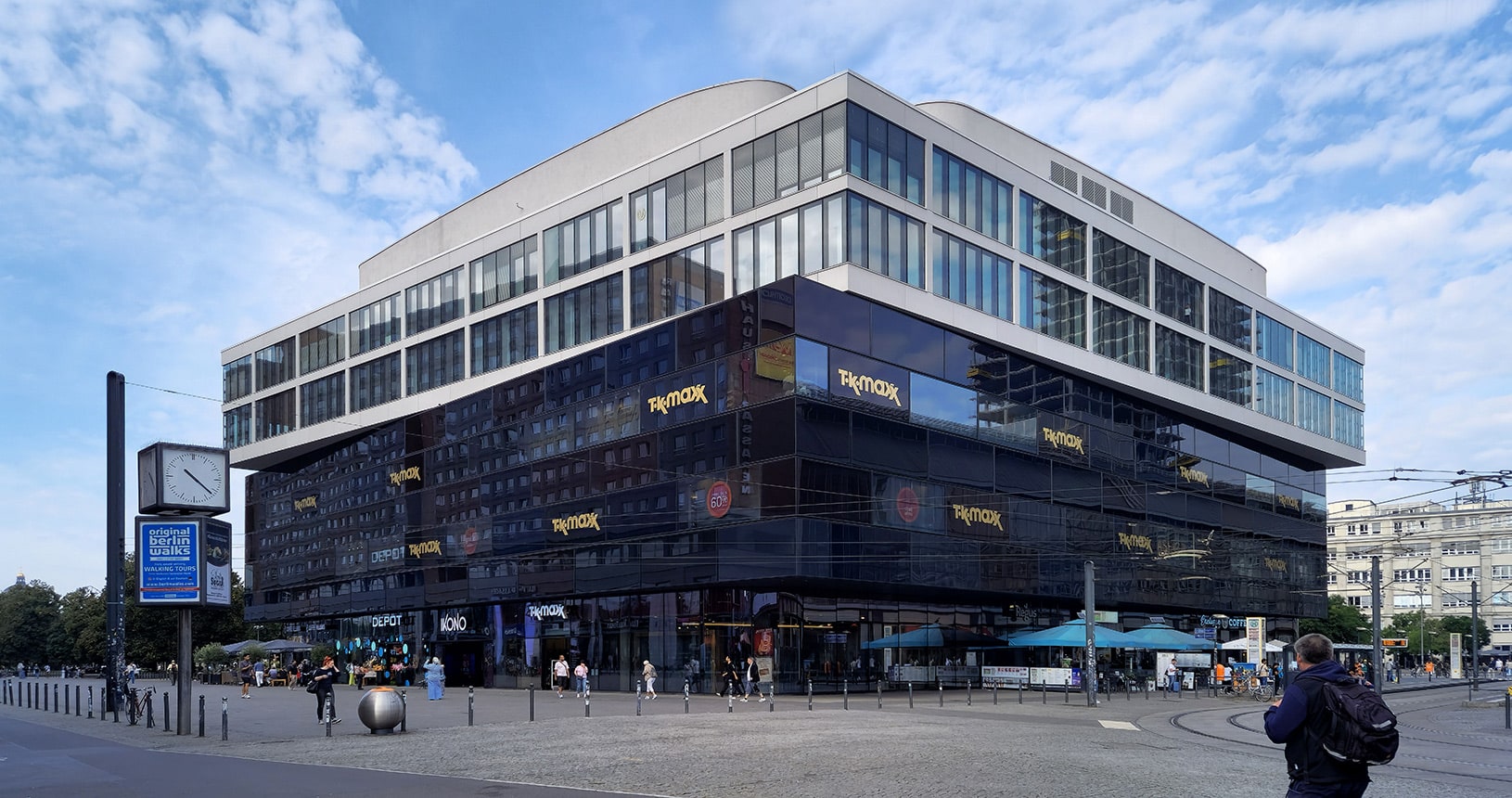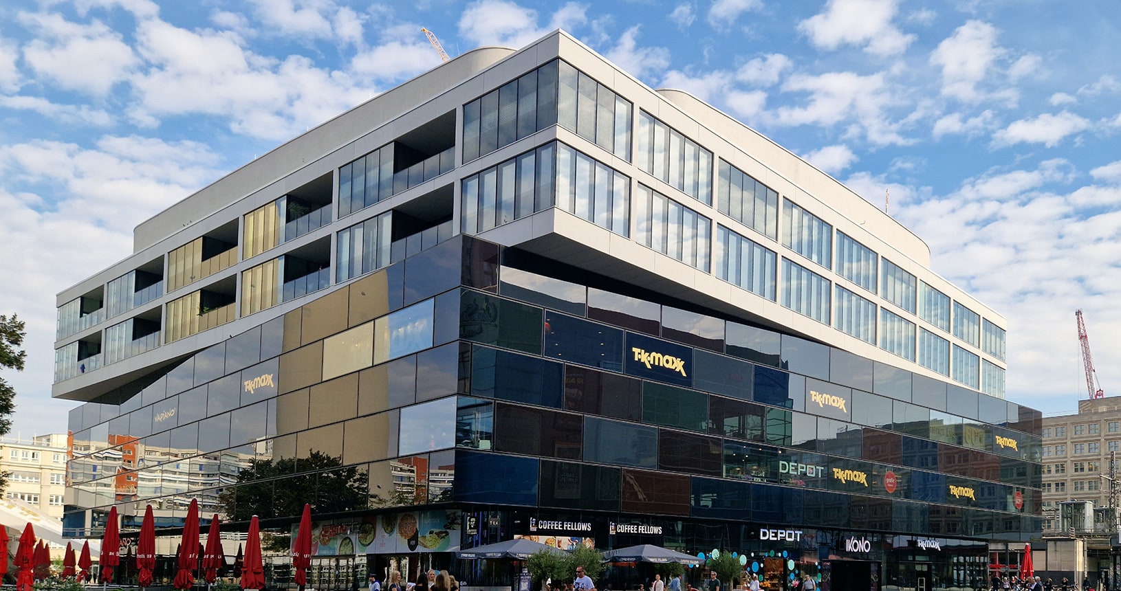 - teilweise gebogene Glasfassade
