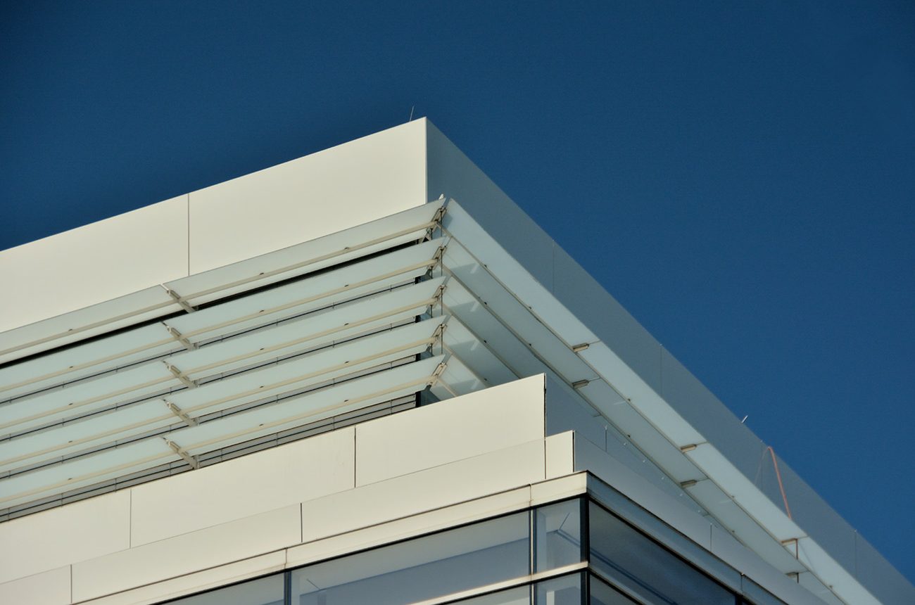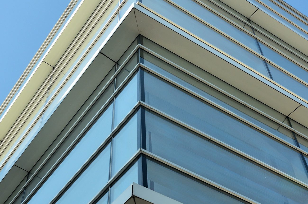- Sonnenschutz im oberen Randbereich aus vorgehängten Glaslamellen